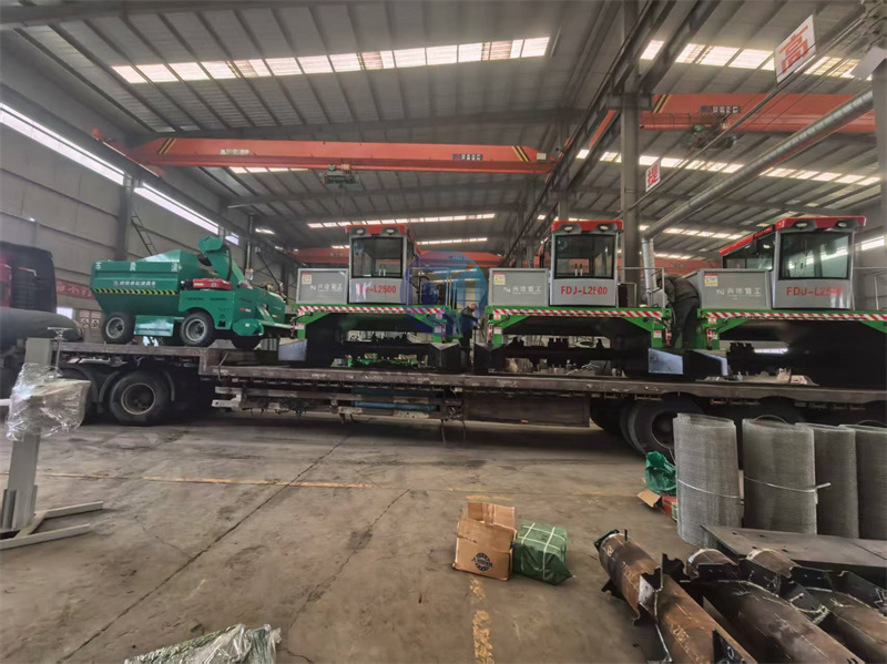 第车三台型 有机肥履带翻抛设备马上完成装车: 履带翻堆机通常由动力系统、传动装置、翻抛机构和控制系统组成。动力系统一般采用柴油发动机或电动机,提供足够的动力以驱动履带和翻抛机构工作。传动装置则负责将动力传递到各个工作部件,确保设备运行平稳可靠。翻抛机构是核心部分,通过旋转的刀片或耙齿将有