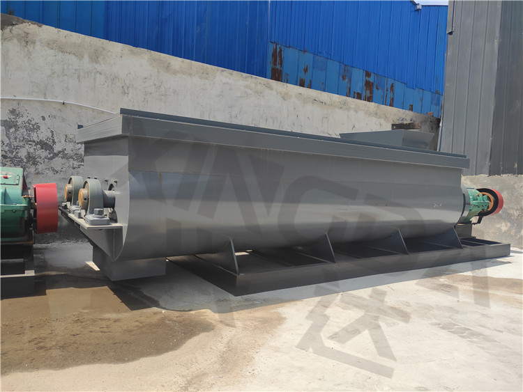 双轴搅拌机是整套有机肥生产线中的一台有机肥设备,在有机肥生产线中用于发酵物料的搅拌利用两根呈对称状的螺旋轴的同步旋转,在输送干灰等粉状物料的同时加水搅拌,均匀加湿干灰粉状物料,达到使加湿物料不冒干灰又不会渗出水滴的目的,从而便于加湿灰装车运输或转入其它输送设备。双轴搅拌机,自动搅拌机,有机肥混料机
