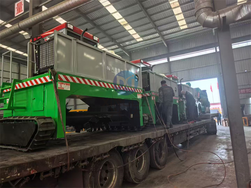 第车三台型 有机肥履带翻抛设备马上完成装车: 履带翻堆机通常由动力系统、传动装置、翻抛机构和控制系统组成。动力系统一般采用柴油发动机或电动机,提供足够的动力以驱动履带和翻抛机构工作。传动装置则负责将动力传递到各个工作部件,确保设备运行平稳可靠。翻抛机构是核心部分,通过旋转的刀片或耙齿将有